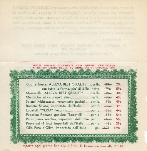 A 1938 coupon from Alleva, America’s oldest Italian cheese shop (est 1892). It’s still open and run by the same family. We stop here on pizza tours and taste fresh mozzarella thats rarely more than 30 minutes old. The owner gave me this amazing artifact and I wanted to post it before it gets sealed up in a frame. NOTE: The coupon is no longer valid.