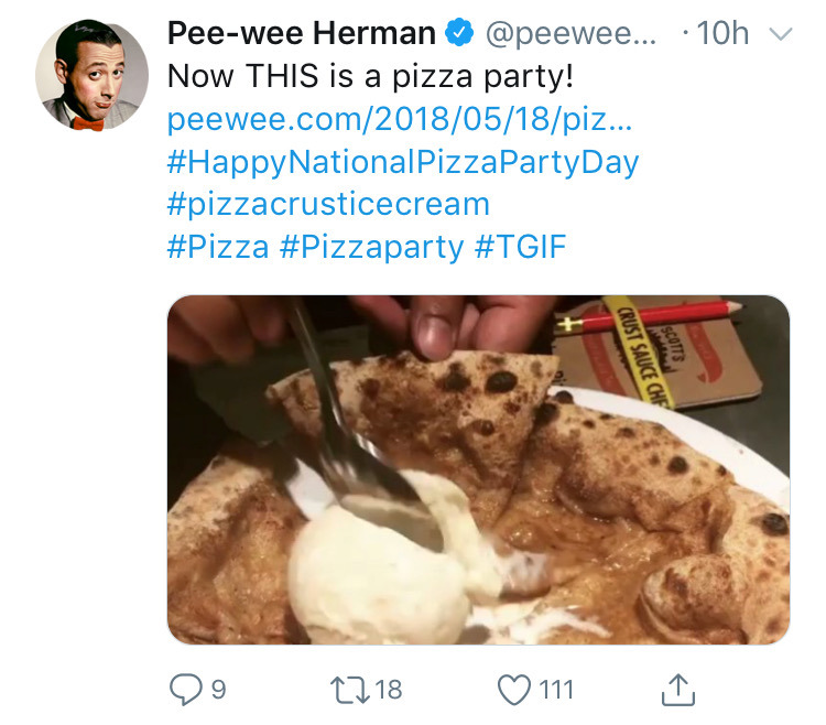 Big thanks to Pee Wee Herman for posting this pic from a recent pizza tour we took to Bruno in the East Village! Someone asked for a dessert pizza so Demian sprinkled some cinnamon and sugar on the dough, then topped it with ice cubes. The ice melted down and dissolved the sugar and cinnamon before cooking off to leave a sweet coating on the dough. Then he added a scoop of his famous Pizza Crust Gelato (milk is steeped with pizza crusts) and the rest is history. I have no idea how Pee Wee Herman ended up with this photo, but I’m glad he did!