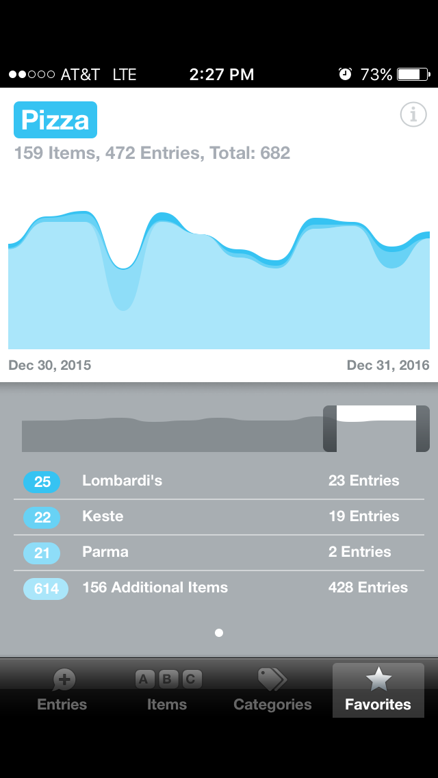 Here’s my pizza intake for 2016. I ate 28 fewer slices than 2015, probably because of my penalty system. I allow myself 15 slices per week but I subtract 2 slices from the next week’s allotment for every slice I go over the limit. I have a feeling I went over 15 pretty often, so my overall count was lower than before.