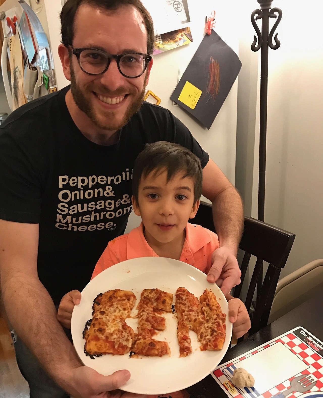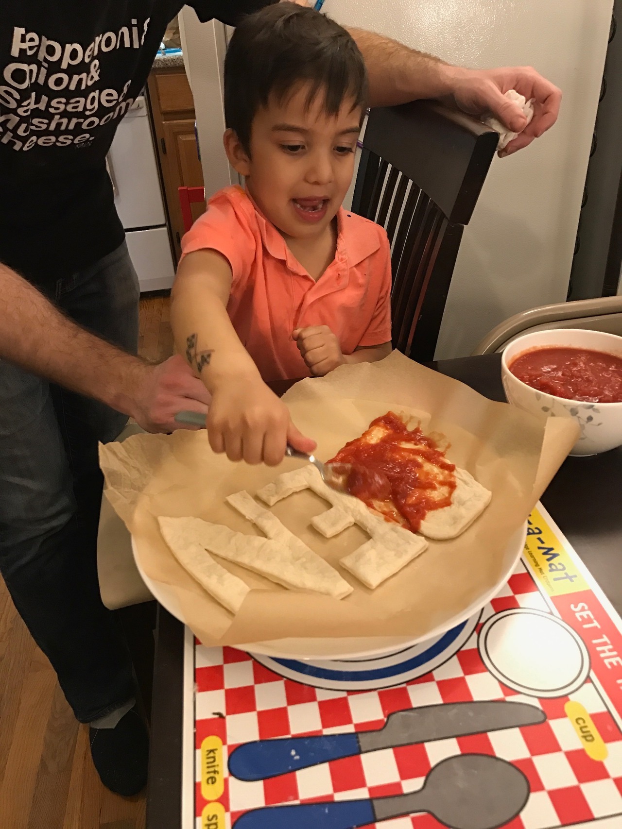 Here’s something fun to do with kiddos! My friend Ben told me he wanted to spell his name in pizza. He got the idea from the cover of a book called Secret Pizza Party. I made a batch of dough, we rolled it out, cut out the letters, put them on some parchment paper, and topped it with sauce and cheese. The parchment paper limited the mess and the results were delicious!