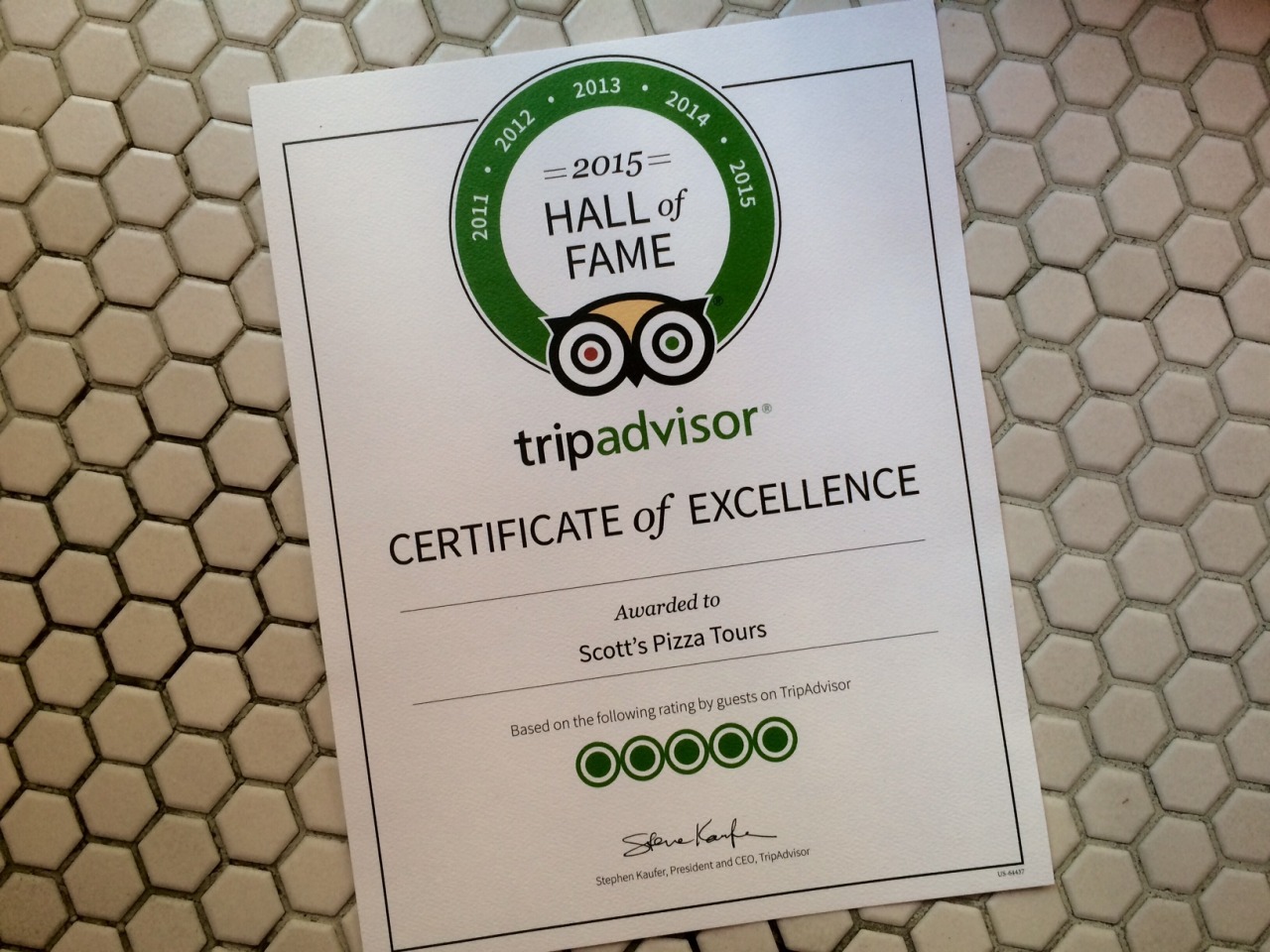 HOT DAMN! We just got this Certificate of Excellence in the mail from Trip Advisor. That’s five years in a row, so we’re in the HALL OF FAME!!!