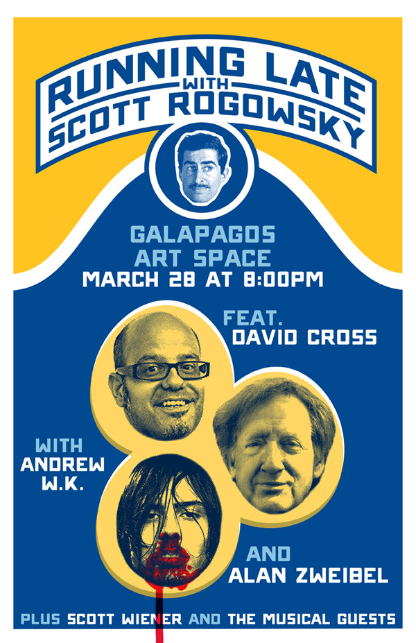 I am beyond excited to be a guest on this Thursday’s Running Late with Scott Rogowsky along with David Cross, Andrew WK and Alan Zweibel. Running Late is a live talk show featuring amazing guests and run by a guy named Scott whose sidekick is his dad. We did a couple videos for his show (watch one here and the other here) and I’m pumped to bring some pizza love to the party.
