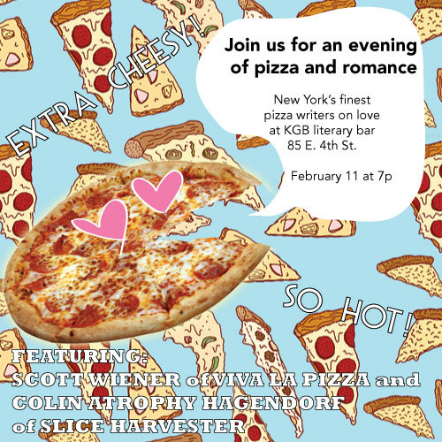 I’m doing a reading tonight at KGB Bar in the East Village. The theme is “Love And Pizza” so I’ll probably have something to say about pizza boxes. I’m mainly going to hear Slice Harvester, a real hero who visited every slice shop in Manhattan and published reviews in an amazing zine. Should be a good time!