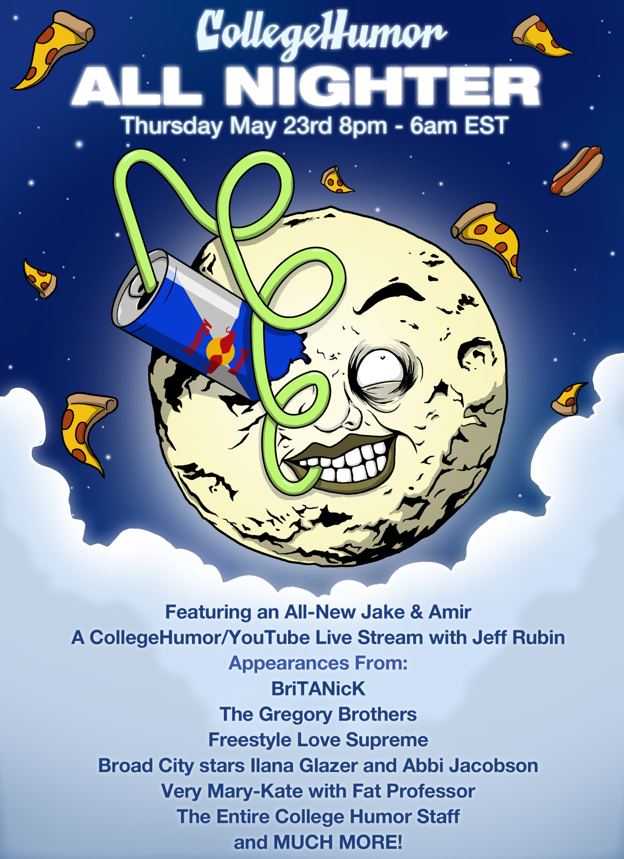 Tonight I am hosting 10 straight hours of live streaming on CollegeHumor, from 8 pm – 6 am. Lots of fun games and guests planned. I’m especially excited for Nature Nick at 10 pm, Tinder Talk w/ Jake & Rosie at 1 am, and Ghost Stories with Sam at 4 am.