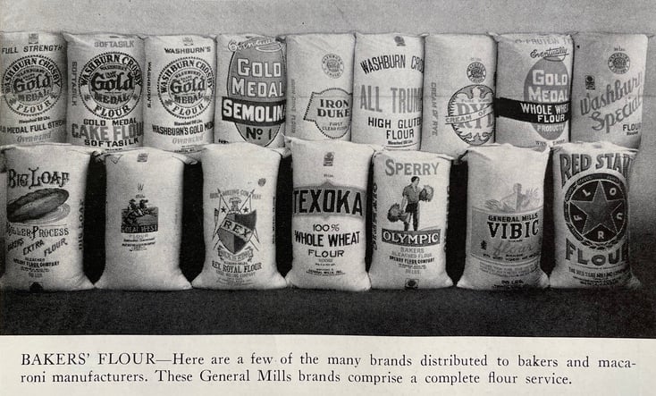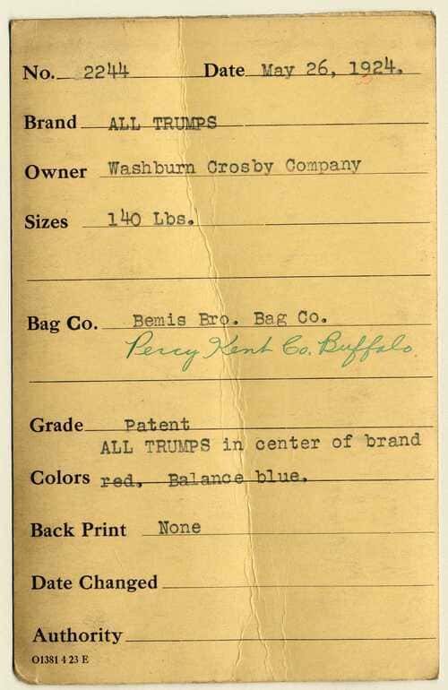 The earliest reference I’ve seen to All Trumps is a 1924 flour sack order from the Washburn Crosby Company (which became part of General Mills in 1928). It’s an order for 140 lb bags from the Bemis Bro. Bag Co. and Percy Kent Co. Buffalo. General Mills was able to find a series of internal memos discussing the need to change the wording on the All Trumps bag from “High Protein” to “High Gluten.” Flour nerds know there’s no gluten in flour, just the necessary protein to form gluten. So making this change was done purely for marketing purposes.