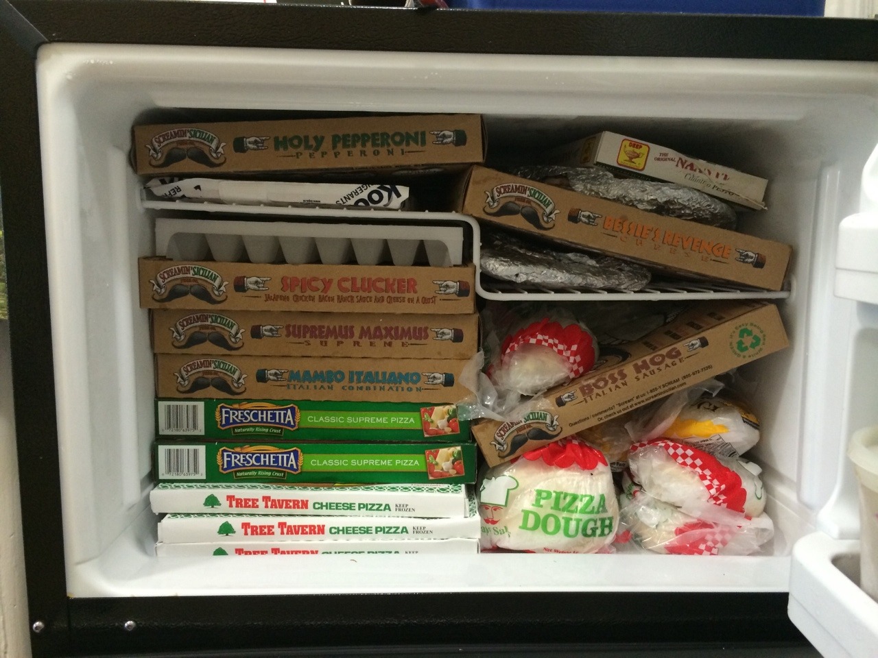 This is my freezer right now. Thirteen frozen pizzas (two from India!), nine dough balls, leftovers from last pizza-making night, three ice cubes.