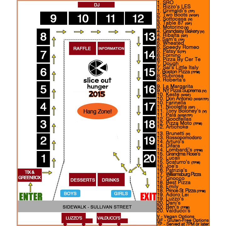 Tomorrow is the most important day of the year for pizza lovers in New York City. Slice Out Hunger is a nonprofit that uses pizza parties to raise money for hunger relief organizations and tomorrow’s $1 slice night aims to fund over 175,000 meals for New Yorkers in need. We’ll have over 50 pizzerias in one room serving $1 slices with all proceeds benefitting Food Bank For New York City. With over 1,100 pizzas, we should be able to take in well over 1,000 attendees at the event. Here’s a floor plan so you can see which pizzerias are attending and where they’ll be stationed. See you there!