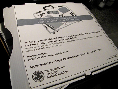 Thanks to @pauliegee for the heads-up about the TSA’s pizza box top recruiting campaign. I really need one of these for my pizza box collection. Read more about the TSA’s recruiting campaign and send me a box if you find one.